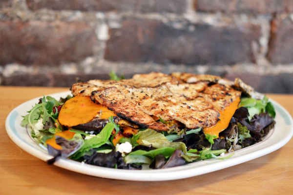 Grilled chicken and basil-rubbed eggplant over mesclun greens, dried cranberries, crumbled feta cheese and a light roasted…