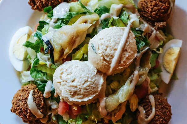 Romaine lettuce, Israeli salad, pickles, chickpeas, hard boiled egg and hummus. Topped with classic tahini sauce and pita grill…